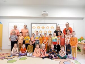 W dniu 31 października grupa „Żabek” zaprezentowała swoje umiejętności na zajęciach otwartych pt.”Zabawy z dynią”. Dzieci w sposób znakomity poradziły sobie z różnymi dyniowymi zagadkami, udowodniły, że świetnie sobie radzą z zadaniami matematycznymi, polonistycznymi i muzyczno – ruchowymi. Na koniec zajęć dzieci z wielką radością zabrały się do odkrywania „dyniowego wnętrza” i wyciągania pestek z dyni.