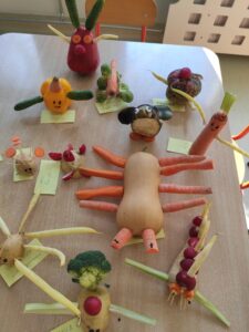 Dzieci z grupy „Krasnale” tworzyły owocowo-warzywne ludki, wykazując się kreatywnością i pomysłowością. Podczas pracy świetnie się bawiły, czerpiąc radość z tworzenia i wzajemnej współpracy. Na koniec konsumowały owoce i warzywa, ciesząc się zdrowymi przekąskami.