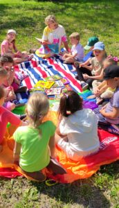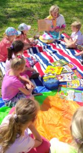 Na terenie placu zabaw swojego przedszkola zorganizowały kącik czytelniczy.