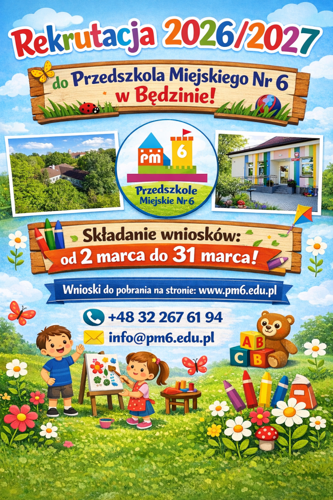 Przedszkole Miejskie nr 6 im. UNICEF w Będzinie | ul. Wisławy Szymborskiej 10a | 42-500 Będzin  Polska | Telefon: +48 32 267 61 94 | E-mail: info@pm6.edu.pl
