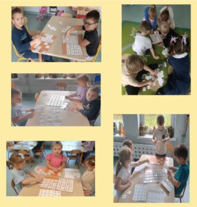 Dziś po raz kolejny z Panią Agnieszką wyruszyliśmy w magiczny świat liter i cyfr. Dzieci podzielone zostały na zespoły. Ich zadaniem było włożenie kartoników w odpowiednie miejsce. Najpierw trzeba było wszystko porozrywać (oczywiście ostrożnie, aby nie potargać), następnie popatrzeć na wzór i włożyć w odpowiednie miejsce. Pracy było co niemiara, jednak wszyscy świetnie sobie poradzili. Gdy coś komuś nie za bardzo wychodziło inni przybywali z pomocą. Pszczółki na medal wykonały zadanie. Były z siebie bardzo dumne.