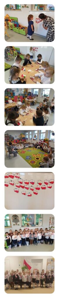 7 listopada w grupie Sowy odbyły się zajęcia biblioteczne . Pani Celinka zapoznała dzieci z wydarzeniami historycznymi z dnia 11 listopada 1918 r. z postacią Marszałka Józefa Piłsudskiego oraz symbolami narodowymi. Dzieci wykonały pracę plastyczną wyklejając kształt Polski białymi i czerwonymi kwiatkami.Wysłuchały wiersza W.Bełzy pt. „Katechizm polskiego dziecka”. W tym wyjątkowym dniu dzieci odświętnie ubrane z kotylionami biało – czerwonymi odśpiewały hymn Polski „Mazurek Dąbrowskiego” pamiętając o należytej postawie.