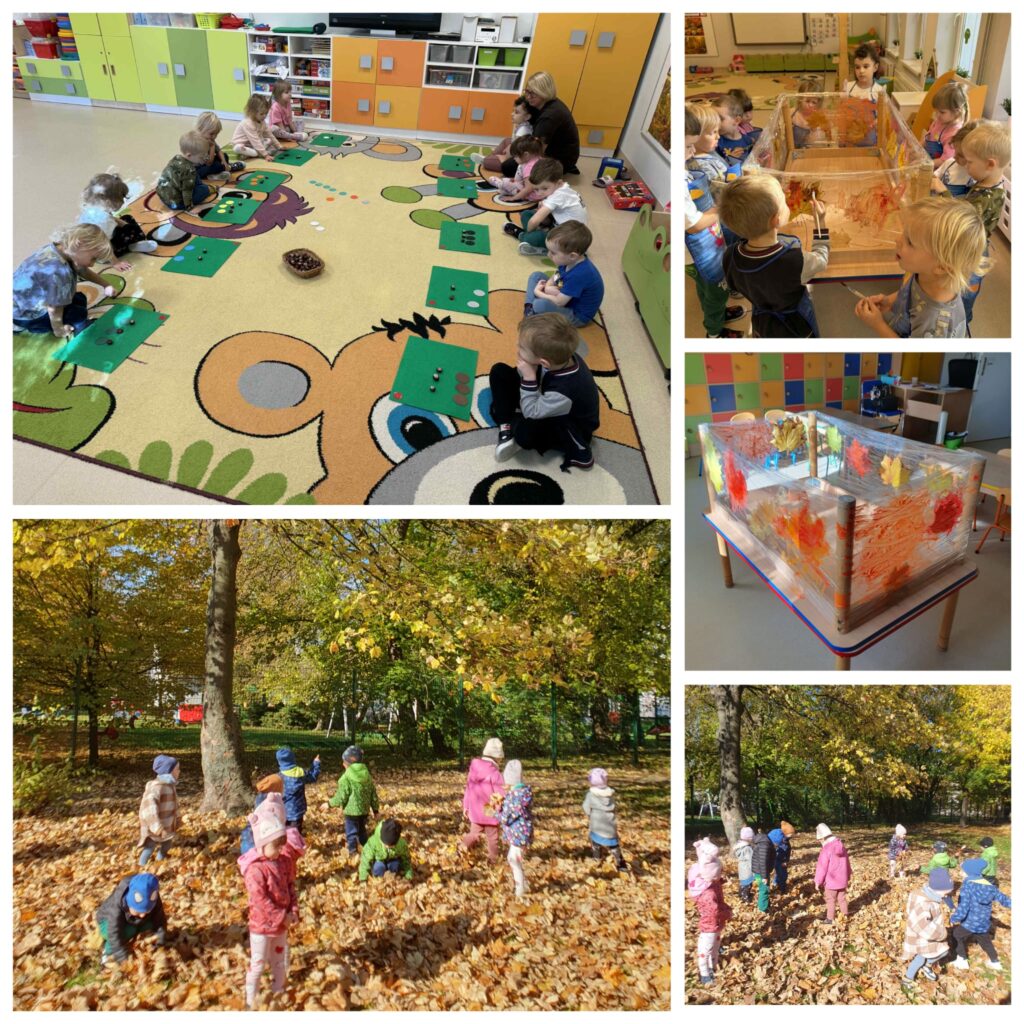 W dniu 23 (czwartek) dzieci z grupy „Żabki” wykonywały zdania matematyczne do programu własnego „na wesoło”, następnie malowały jesienny pejzaż farbami. Nagrodą za aktywność na zajęciach była sensoryczna zabawa wśród kolorowych liści. Dzieci rozwijały wrażliwość estetyczną i kreatywność poprzez aktywny udział w zadaniach i zabawach.