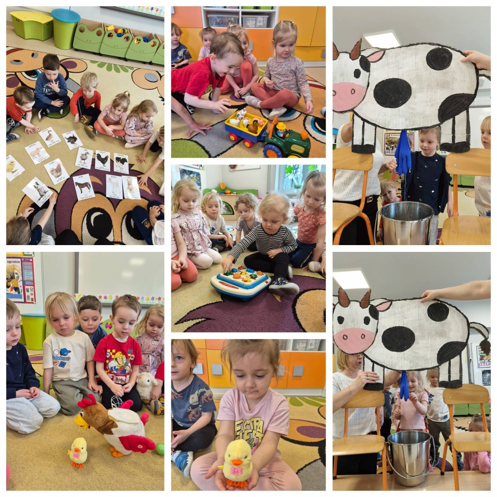 Wczoraj dzieci poznały życie na wsi. Maluchy ćwiczyły rozpoznawanie i nazywanie zwierząt gospodarskich. Rozmawialiśmy o tym, skąd biorą się produkty takie jak mleko i jajka. Podczas zajęć „doiły” krowę w formie zabawy oraz dowiedziały się, jak kura znosi jajka. Zajęcia były połączone z zabawą i aktywnościami ruchowymi.