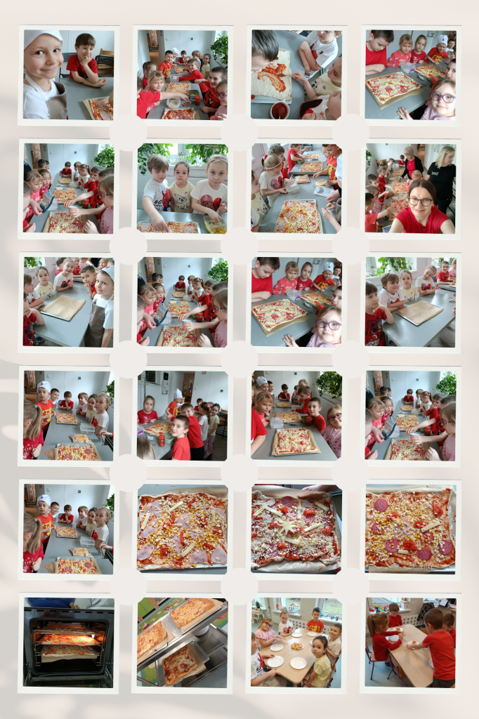 Pieczenie pizzy w przedszkolu jest wspaniałą i radosną zabawą oraz kompleksowym zajęciem edukacyjnym angażującym wszystkie zmysły. Ćwiczymy motorykę małą poprzez smarowanie pizzy sosem i układanie na niej dodatków; przeliczaliśmy plastry szynki i salami; dzieliliśmy pizzę na kawałki. Uczyliśmy się także współpracy ze sobą, a na koniec było najtrudniejsze zadanie: musieliśmy czekać, aż pizza się upiecze. Było warto, ponieważ była przepyszna. Jesteśmy prawdziwymi szefami kuchni! Następnym razem planujemy zrobić zdrowe, owocowe szaszłyki.