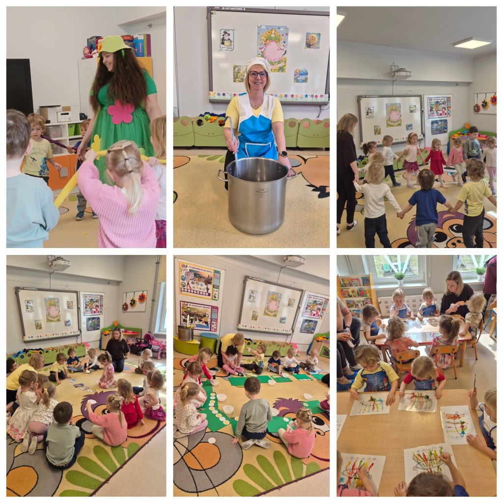 Kolejnym elementem były zabawy ruchowe naśladujące zmieniającą się pogodę – dzieci „tańczyły jak wiatr”, „padały jak deszcz” oraz „świeciły jak słońce”. Dużym zainteresowaniem cieszyły się również zabawy sensoryczne, podczas których dzieci „mieszały w garnku pogodę”, dobierając odpowiednie symbole i elementy.